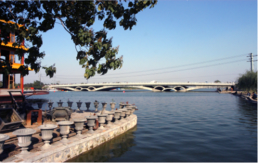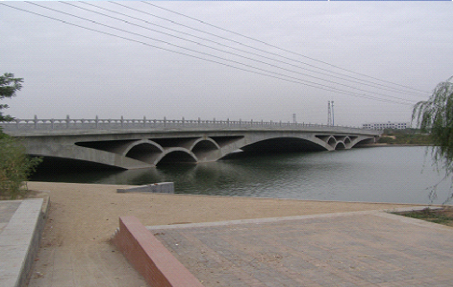 滹沱河汊河红星街桥梁工程位于红星街跨汊河处,与汊河正交,工程造价1854.75万元 ,2004年6月开工 ,2005年10月竣工。主桥为跨径组合33.5m+65m+33.5m ,桥面宽23m 。该桥梁首次采用高强低松弛预应力拉索 ,箱室共176个,总张拉力达到38700KN;上部结构为连续梁拱组合预应力桥,下部结构为钻孔灌注桩接钢筋混凝土承台;最大跨径65m,是当年我国长江以北地区跨度最大的混凝土拱桥。该工程工艺先进 ,技术含量高,施工难度大。高强低松弛无粘结预应力钢铰线水平拉索、混凝土体外拉索在技术 、质量、运用上创三项新高。