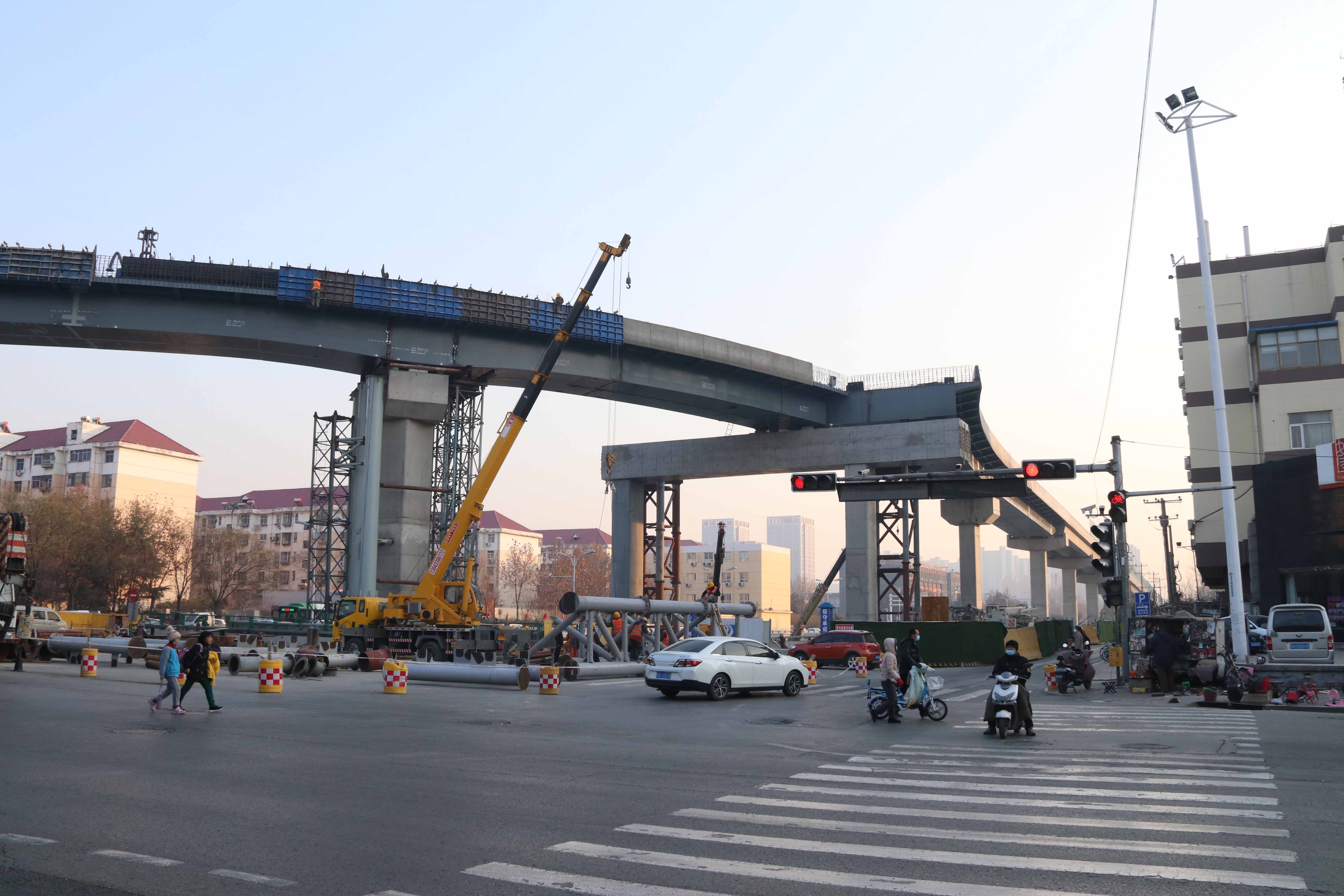 目前,槐安路西二环立交一期工程已完成全部桩基施工,承台施工累计完成83%;墩柱施工累计完成76%,预制梁架设完成18片。钢箱梁东向南匝道7-12号桥已吊装完成。