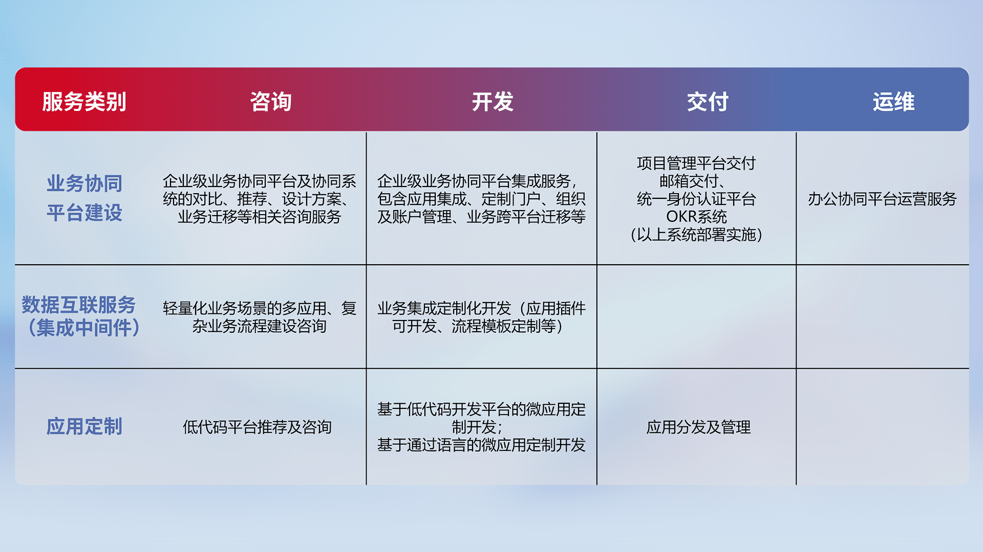 针对钉钉、、、、企微、、IDaas等平台级产品提供产品的规划、、方案、、交付、、、、定制化开发等服务,,,实现如统一协同办公、、、智能客户服务、、混合会议管理、、、、智能数据查询、、、、等业务场景,,,,实现数字化转型。。。。