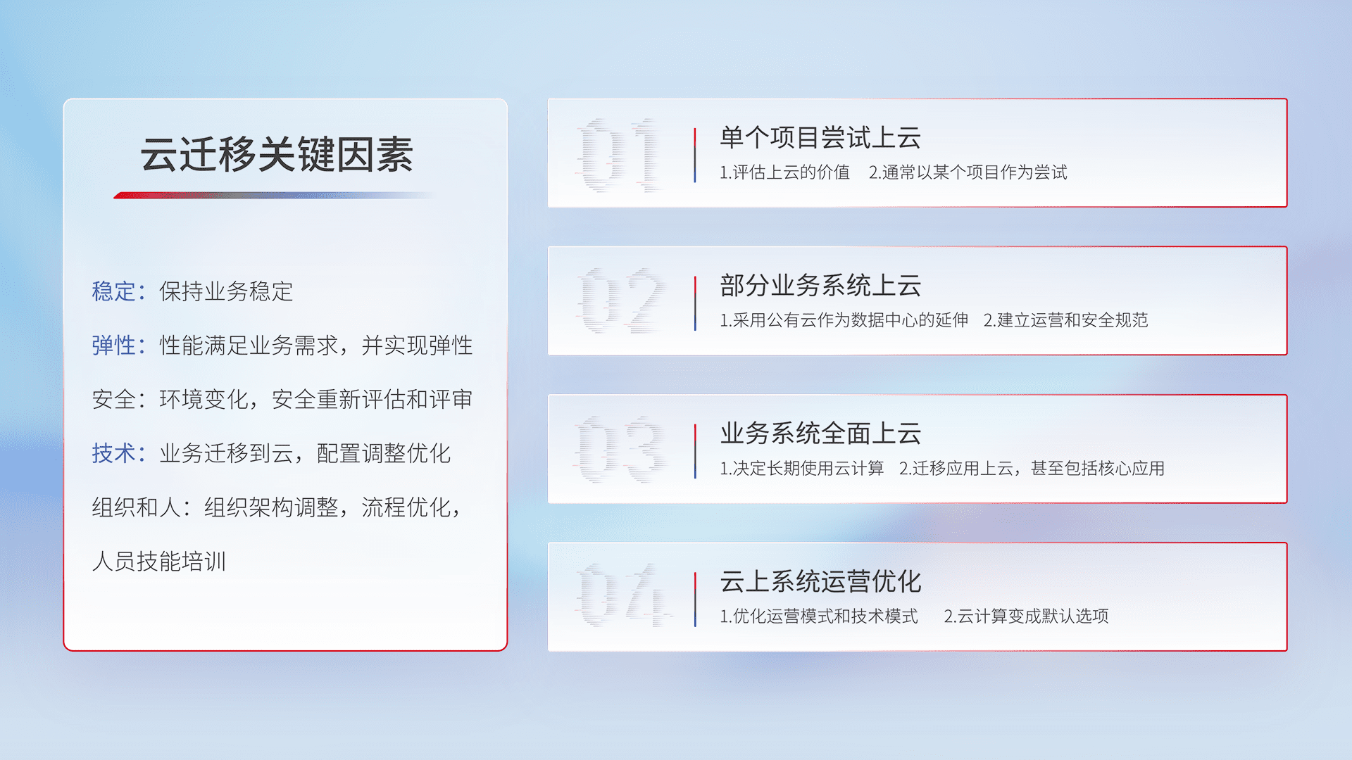结合实际业务,,,从规划设计、、云平台选型、、、云原生改造、、、、数据迁移、、、集成交付,,,,迁移全过程为客户识别最佳上云路径,,,做好风险识别管理,,,,设计网络架构、、、身份权限、、、安全审计合规、、、操作审计、、日志审计、、、监控告警策略、、、多站点容灾设计等,,,,对云上基础设施进行整体规划,,,,提升IT治理水平,,,以满足弹性、、、、高可用、、、高性能的需求。。