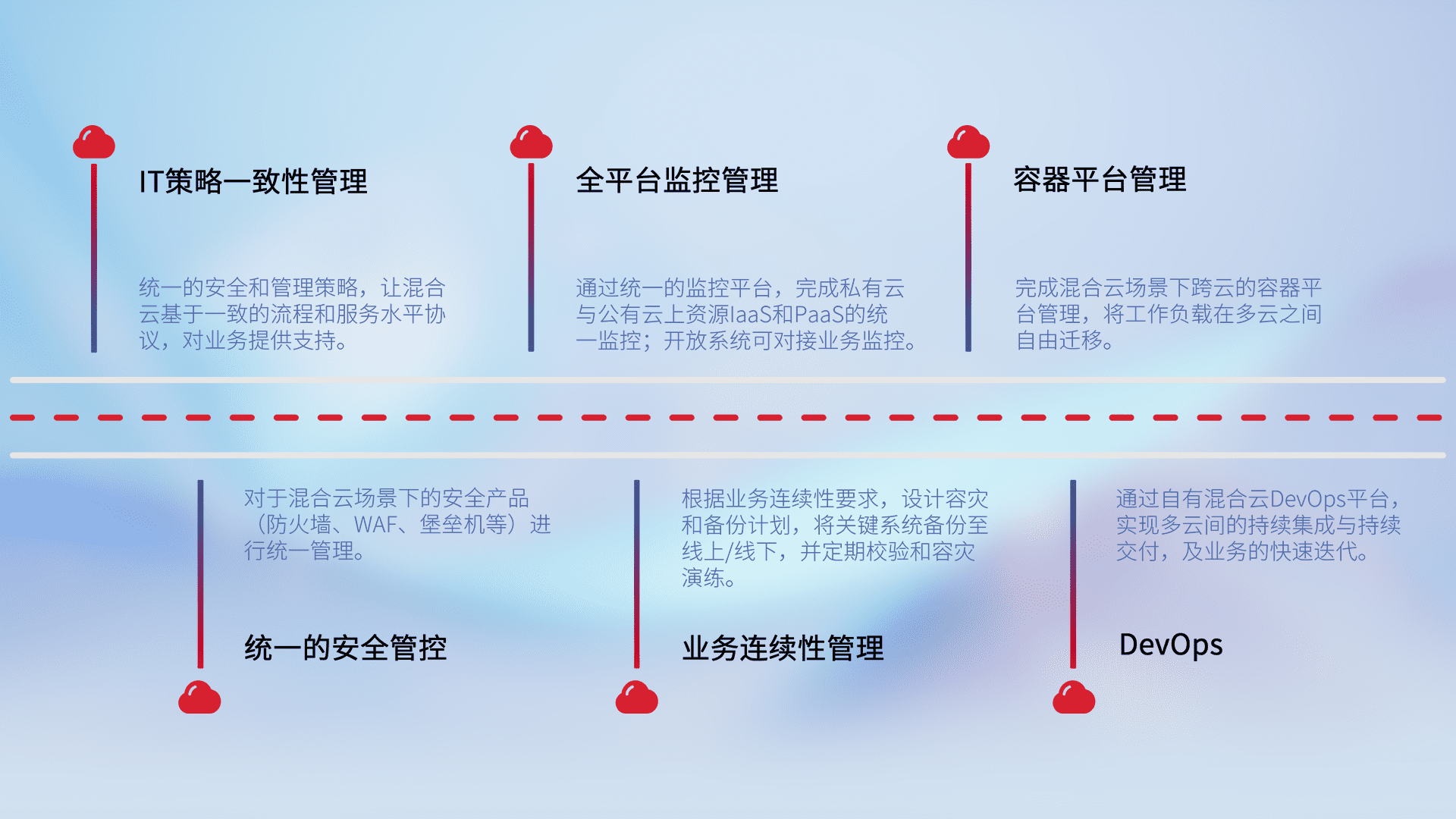 通过多云纳管,,,以统一的资源数据模型把客户的云资源进行抽象和封装,,进而实现对多云资源的统一操作,,,,保障云资源管理的可靠性、、稳定性与可用性。。量身定制化运维内容,,,,配置、、、、开发运维、、、、补丁管理、、、备份、、、、监控、、、认证和访问管理、、、、审计和日常巡检等,,保障在用云过程中的可靠度,,,,稳定度以及高可用率。。